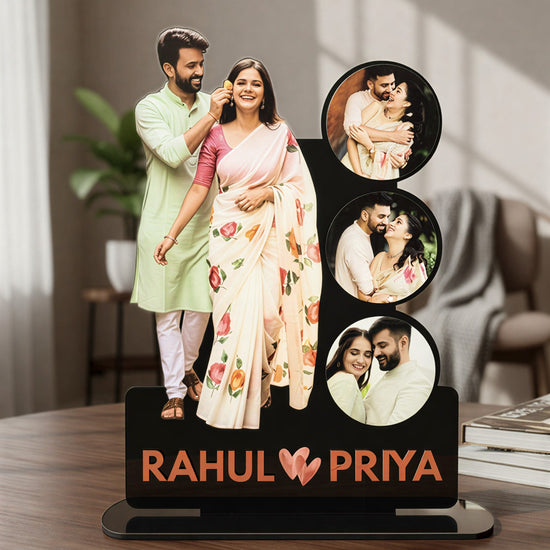 Designed with a full-length couple cutout and three circular photo highlights, this standee beautifully showcases your most memorable moments. Finished with customised names at the base, it makes a perfect keepsake for couples.